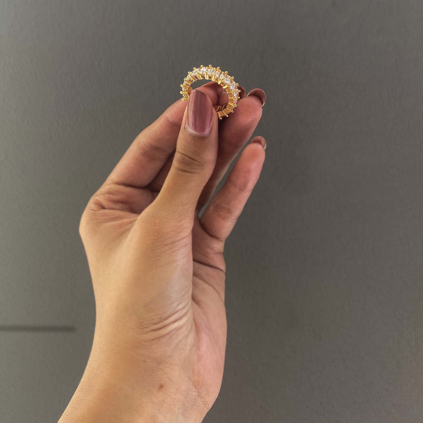 The Eternal Radiance Gold Ring offers a sophisticated and luxurious design that captures the essence of timeless elegance. Featuring radiant rectangular-cut stones set on a beautiful gold-toned band, this stunning piece exudes a brilliant sparkle from every angle.