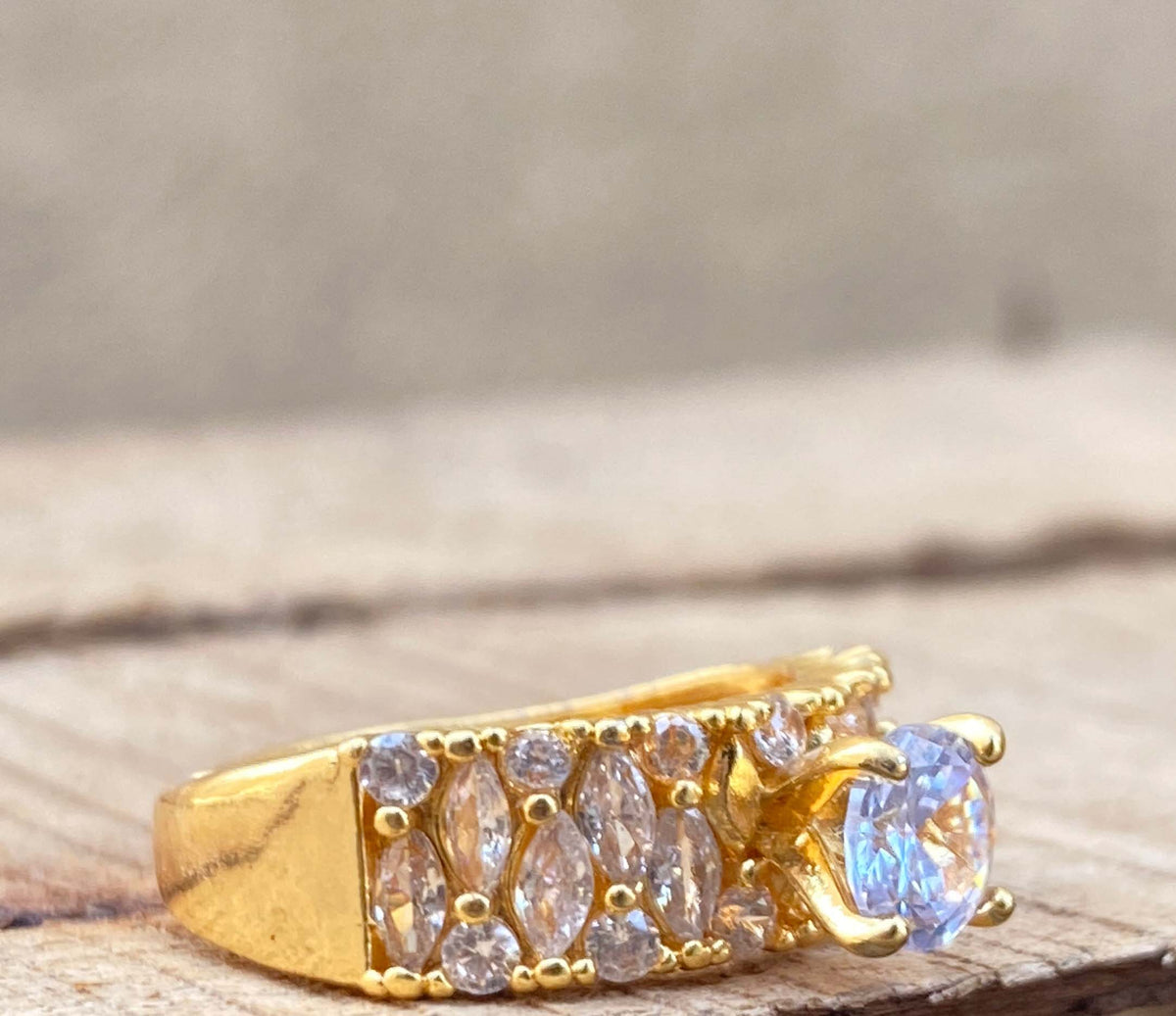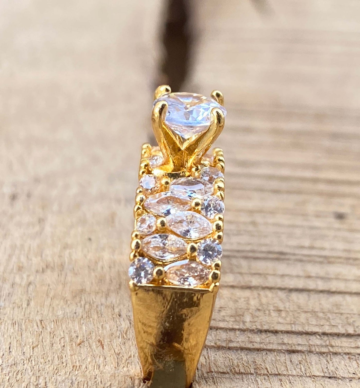 The Golden Elegance Oval Cut Ring exudes luxury and refinement with its stunning design. Featuring a captivating oval-cut center stone surrounded by sparkling marquise-shaped stones, this ring offers a modern yet timeless appeal. The gold-tone band provides a sleek and polished finish, making it an ideal piece for any occasion.
